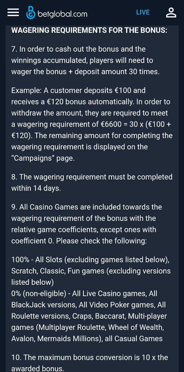 Here the absolutely crucial terms and conditions of the bonus. You must not do any of these while playing through your bonus or BetGlobal will void your winnings:
