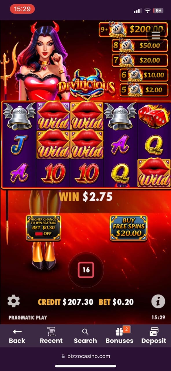 Describing my experience with Bizzo, I named quite a few games I personally played and managed to win real cash sums. Some of the top-rated titles at Bizzo are Games of Olympus 1000 with 98.3% RTP, Sugar Rush 1000 with 99.1% RTP, Alchemist with 98.4% RTP, Book of Ra Deluxe with 99.6% RTP, Chillies in Red with 97.7% RTP, Wolf Gold with 99.6% RTP and the list goes on. When previewing any pokie, you can see its RTP rate, the number of people currently playing the game and the provider’s name. This is quite handy. Note that you can play all pokies in demo mode without creating an account.