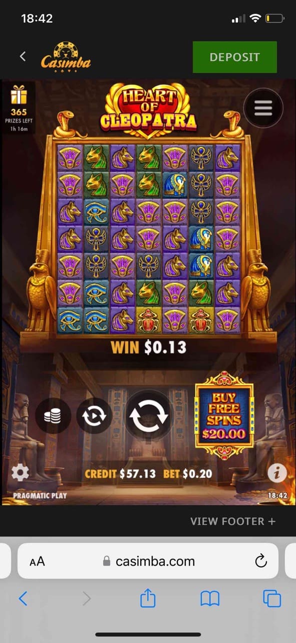 BonBon Bonanza, Magnetic Wild, Tomb of Gold, Gladiator Clash, Gemstone Mine, Super Box Bonus, Cleopatra Hyper Hits, Big Buzz, Big Bass Bonanza, Arabian Wins. Overall, the slots category had a whopping 4,404 games at the time of reviewing the casino. The choice of themes is stunning including animals, sci-fi, ancient Egypt, Irish, etc. The average RTP of Casimba pokies is about 95%.