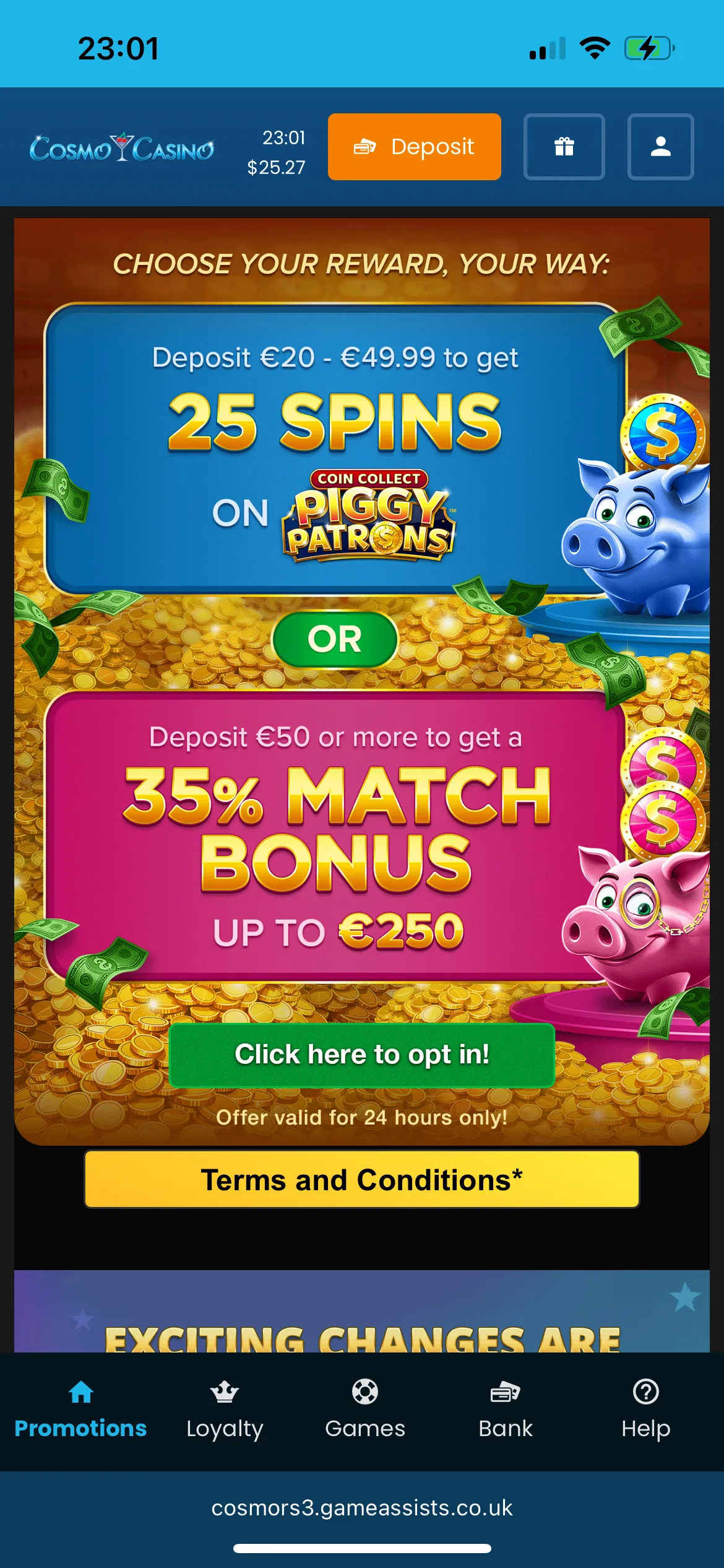 Cosmo Casino NZ login process is standard, and I completed it within a few minutes. The minimum deposit I needed to make to get a bonus was 10 NZD. I instantly received 150 Cosmo Casino free spins on Mega Millionaire Wheel and won a large sum of 15.26 NZD.
