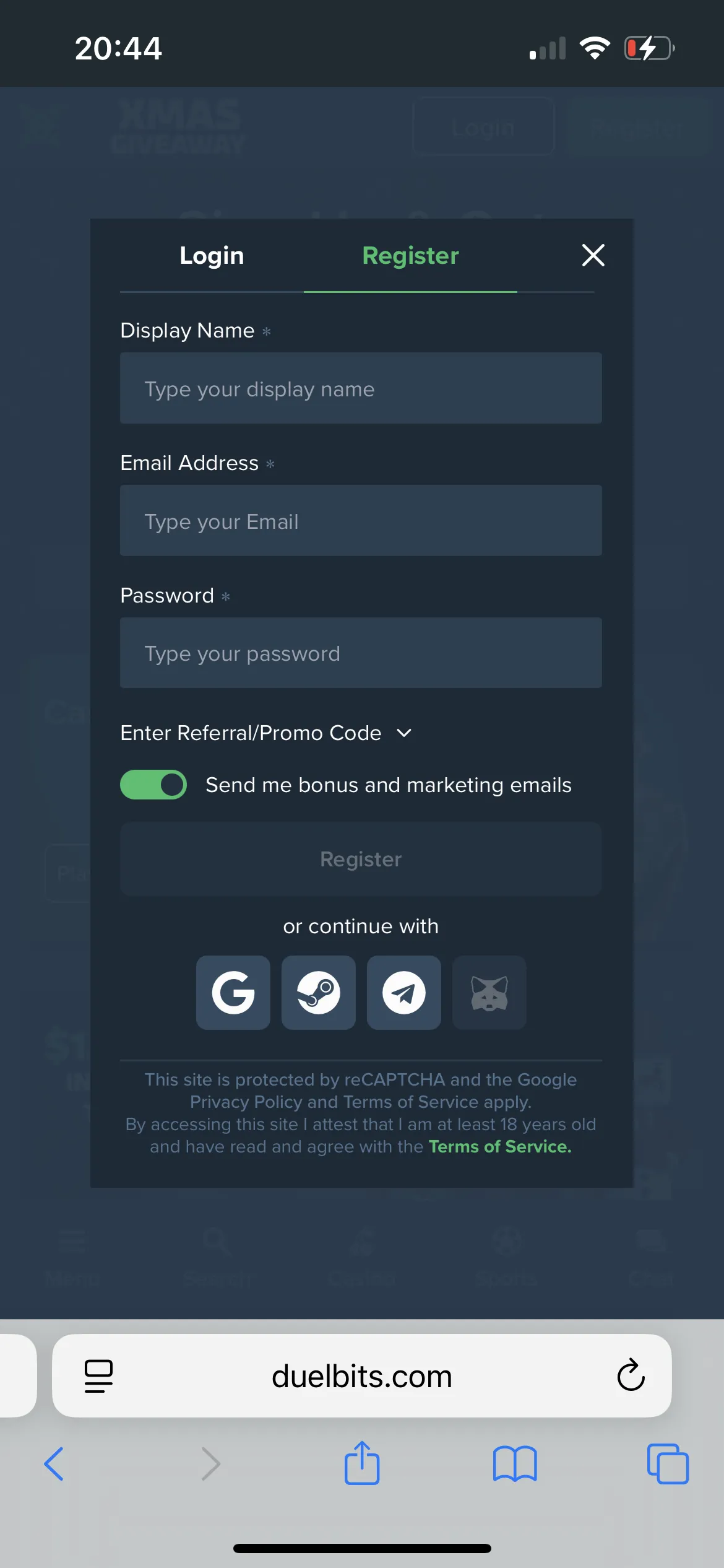 Let me start with registration. Creating an account at Duelbits casino is super simple. You can complete registration via your email, Telegram, and Steam. I chose an email registration option, added my personal info, confirmed my email, and my account was set up in a minute.