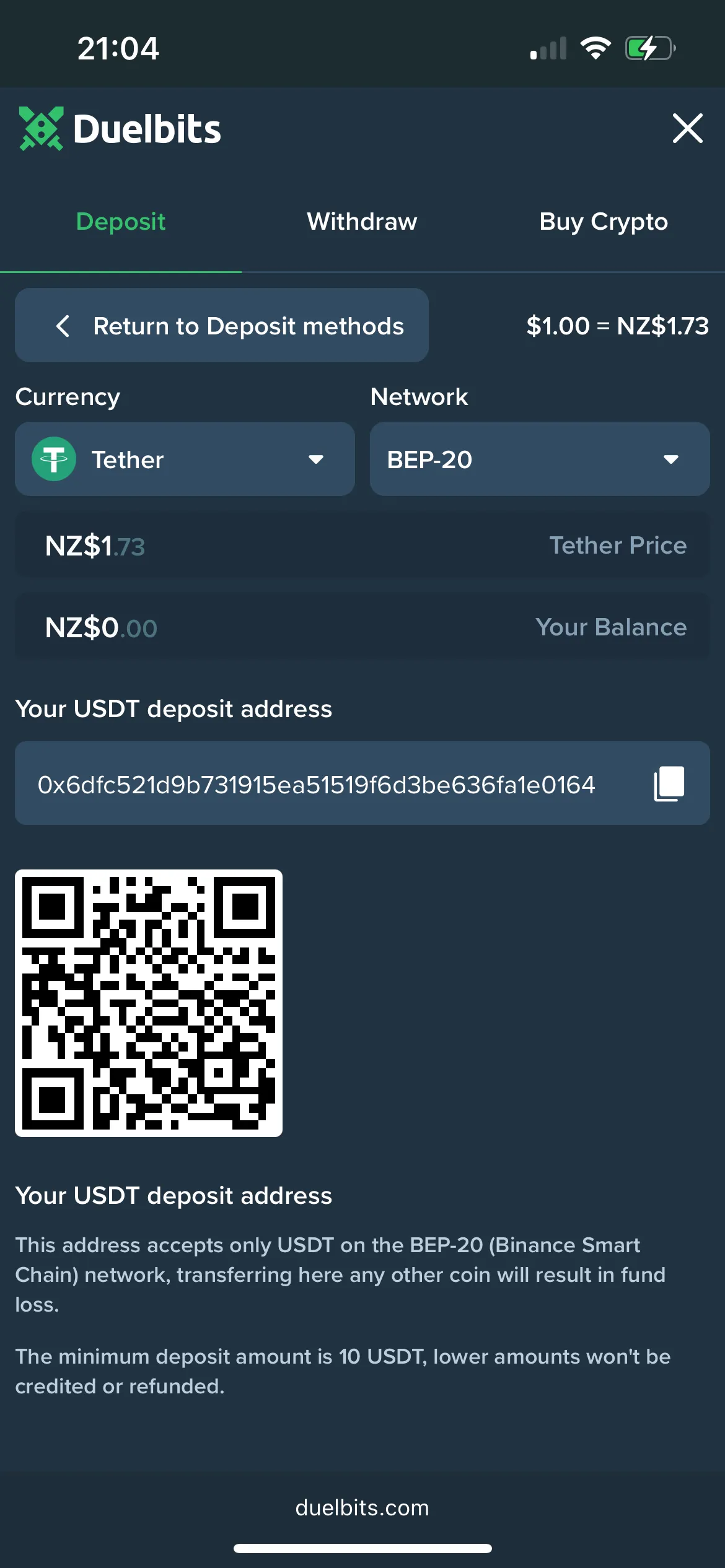 So, I chose Tether to fund my account. I put 20 USDT via the BEP20 network. The commission is only 0.01 USDT. The money arrived instantly into my balance, so I immediately started playing the eligible pokies provided in bonus terms.