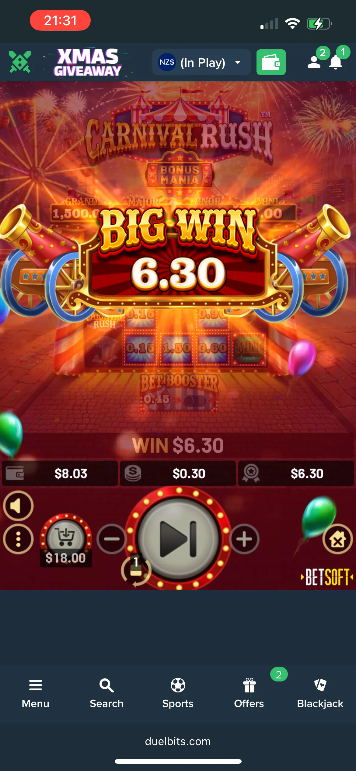 The games I managed to test were Coins Of Alkemor: Hold And Win, A Big Catch: Hold And Win, Big Bass Splash, where I triggered 12 free spins and won 4.45 NZD, Coins Of Ra Power: Hold And Win, Brainwashed, Black Friday with 3 NZD and then 2 NZD wins, Discofarm: Hold And Win, Devil’s Finger, Coins Of Zeus: Hold And Win, Carnival Rush with a win of 6.30 NZD and Buffalo Gold Canyon.