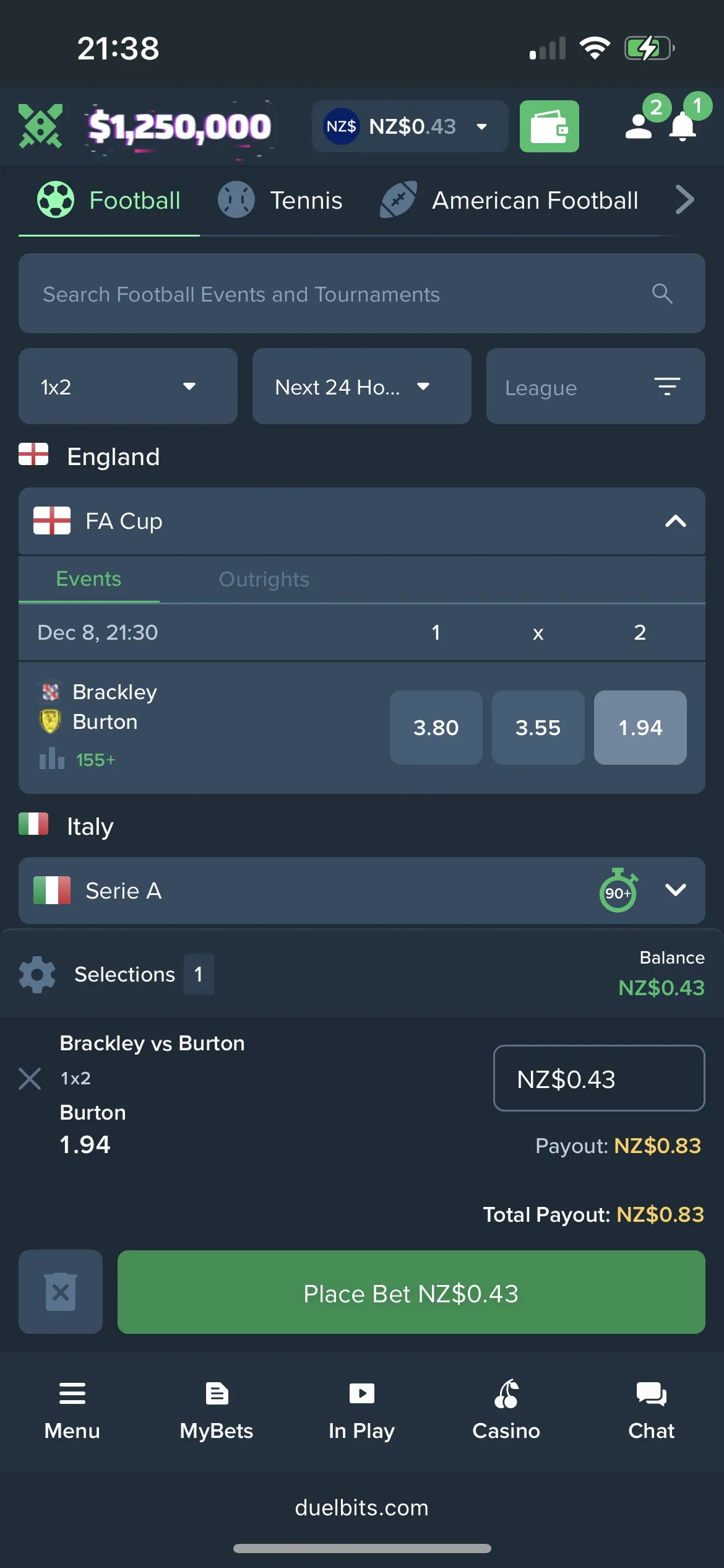 With this sports bonus, players who place a wager on a football match in the top five European leagues will get a free 100 NZD bet if a winning bet turns into a losing bet during stoppage time. The bet must be within the 1×2 market for this offer. This promotion protects players from last-minute heartbreak up to 100 NZD as a free bet. No Duelbits bonus code needed to get this sports offer.