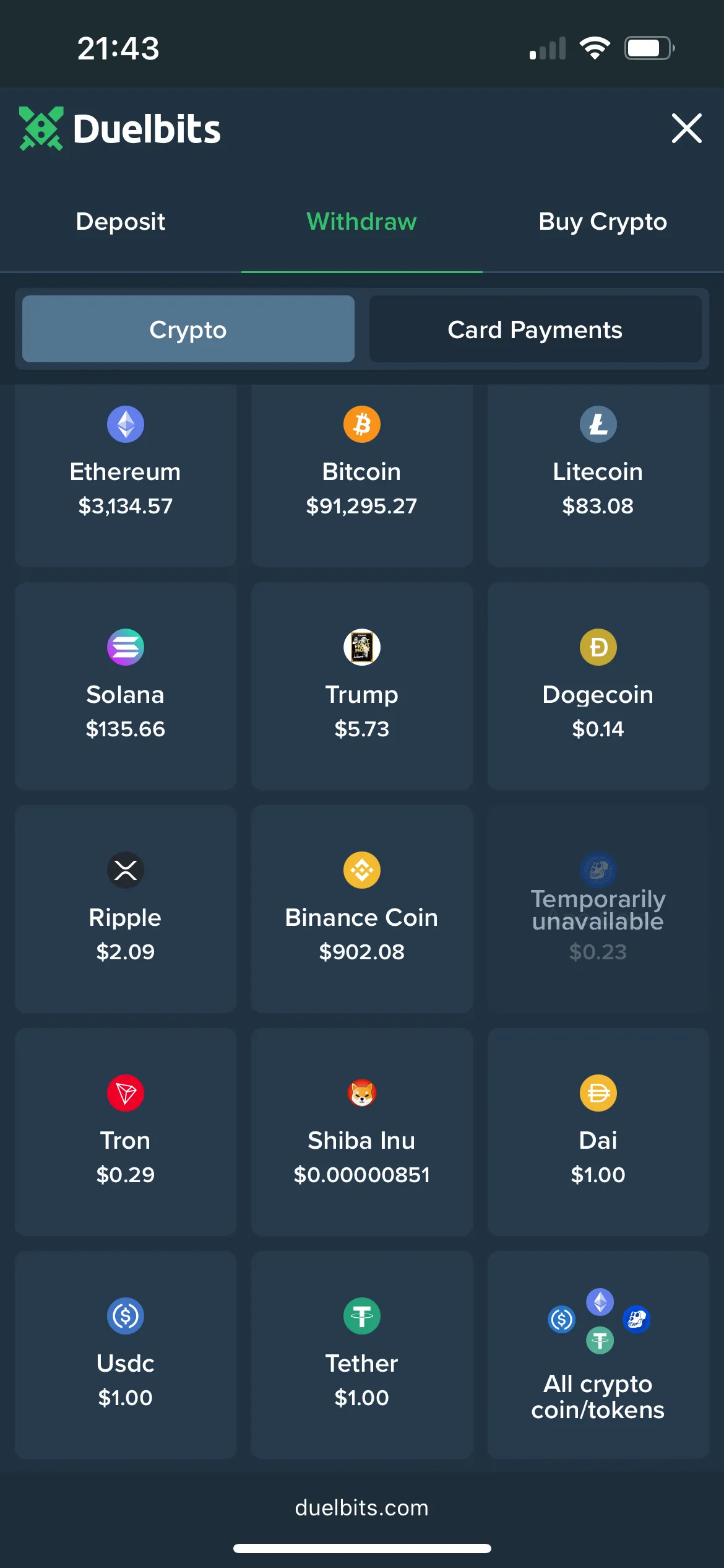 As I was going to make a deposit, I came across a wide range of coins. Duelbits is a crypto-friendly casino and sportsbook, so you can expect a great choice of options. If you want to fund your account with one of the cryptocurrencies, you can do it right away. However, if you want to go with a traditional option, like a bank card, you must complete a KYC check.