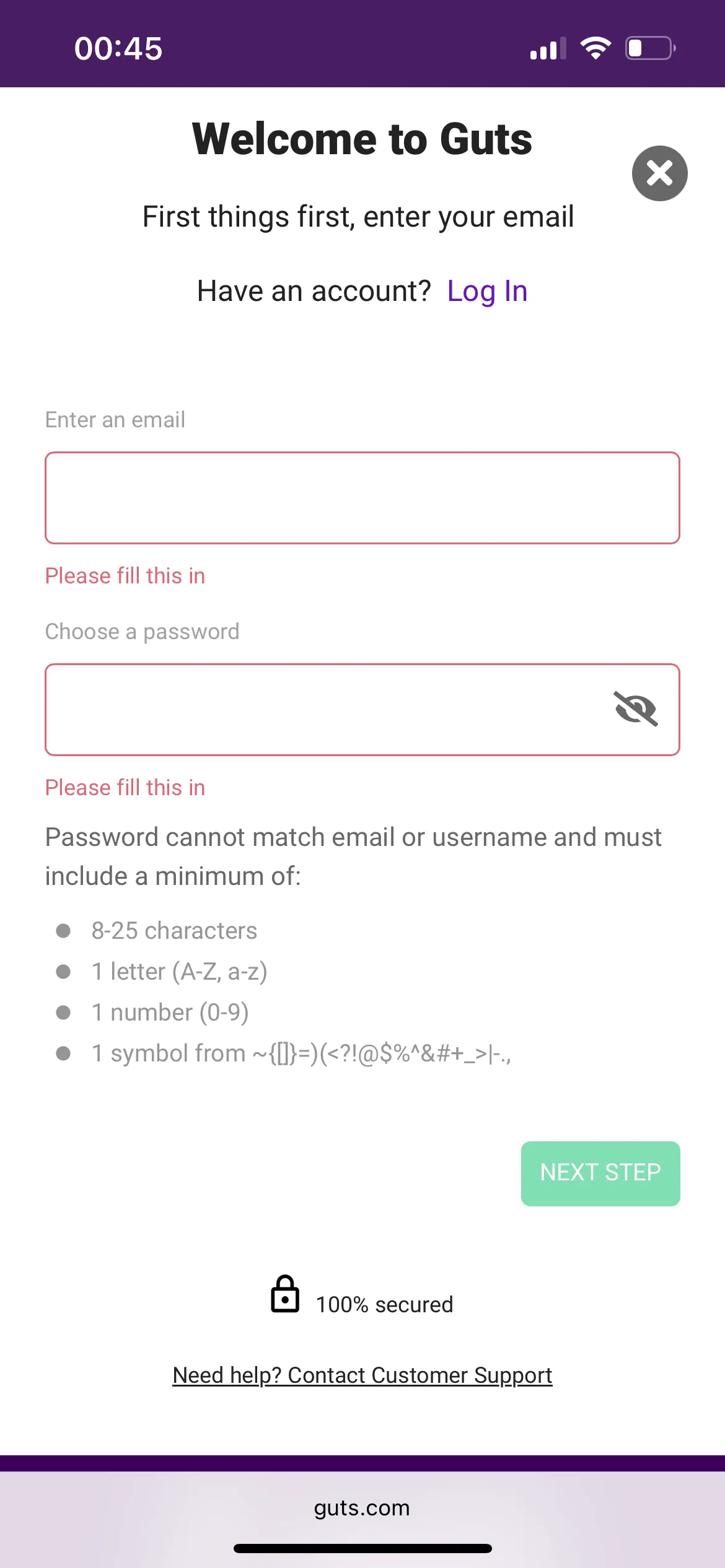 The registration procedure at Guts Casino is not different from what I experienced at other gambling sites. The information you will have to provide includes: