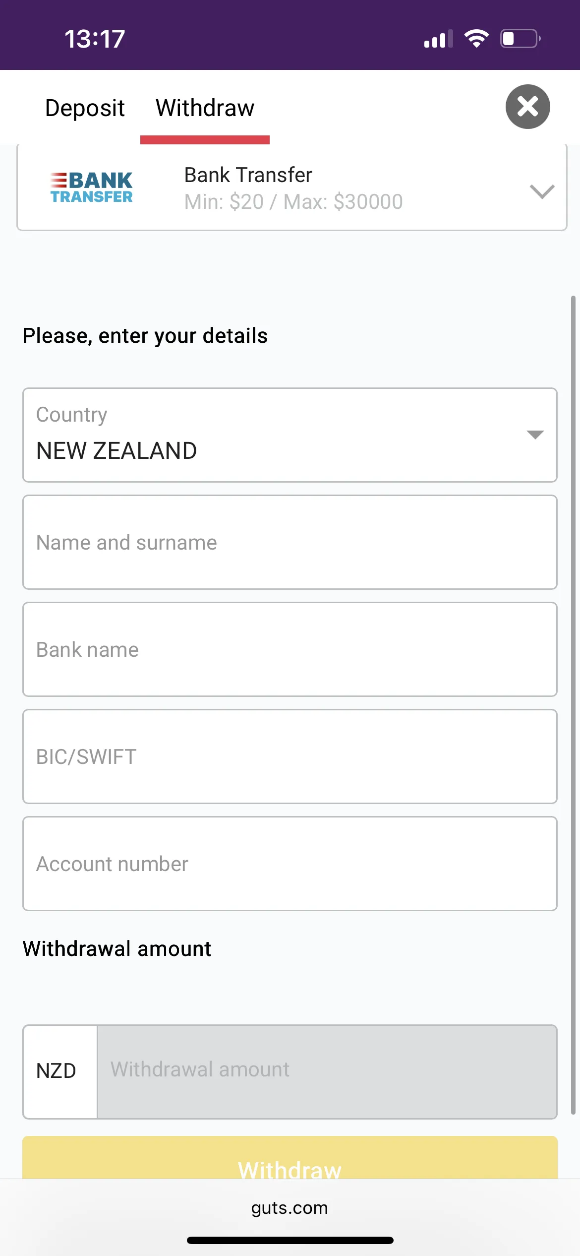 Unfortunately, Guts Casino does not provide a large choice of options, yet it has all the reliable and recognised payment methods widely used in New Zealand. The platform doesn’t cater to crypto users, so if you usually use digital currencies, you will have to choose a fiat alternative. Probably, e-wallet will be the fastest deposit and withdrawal method for such players.