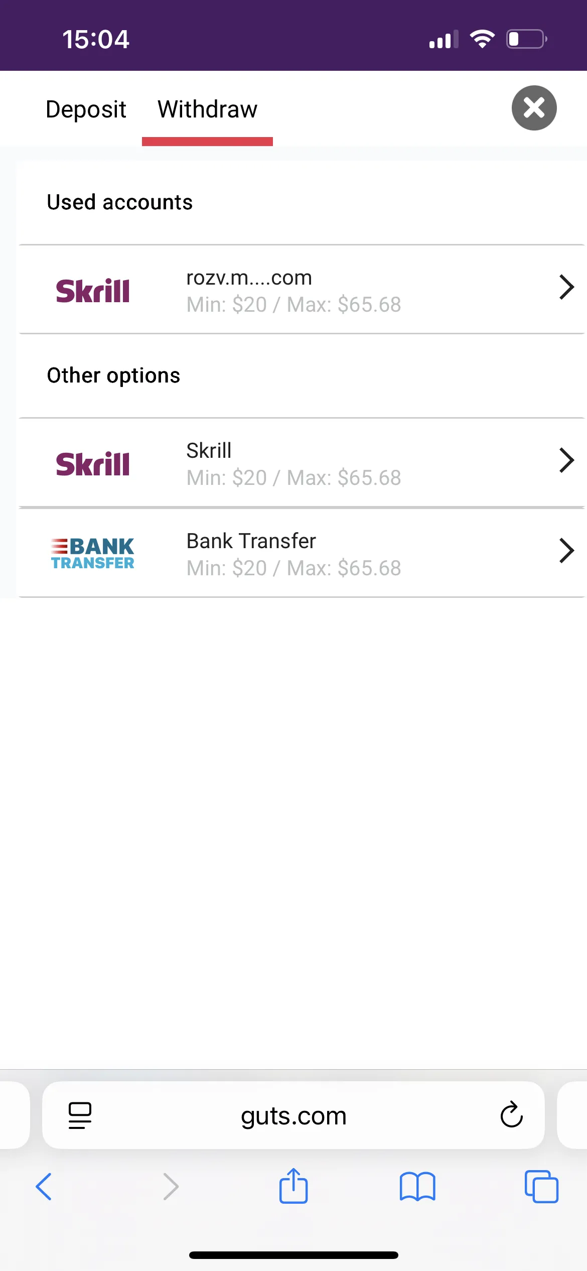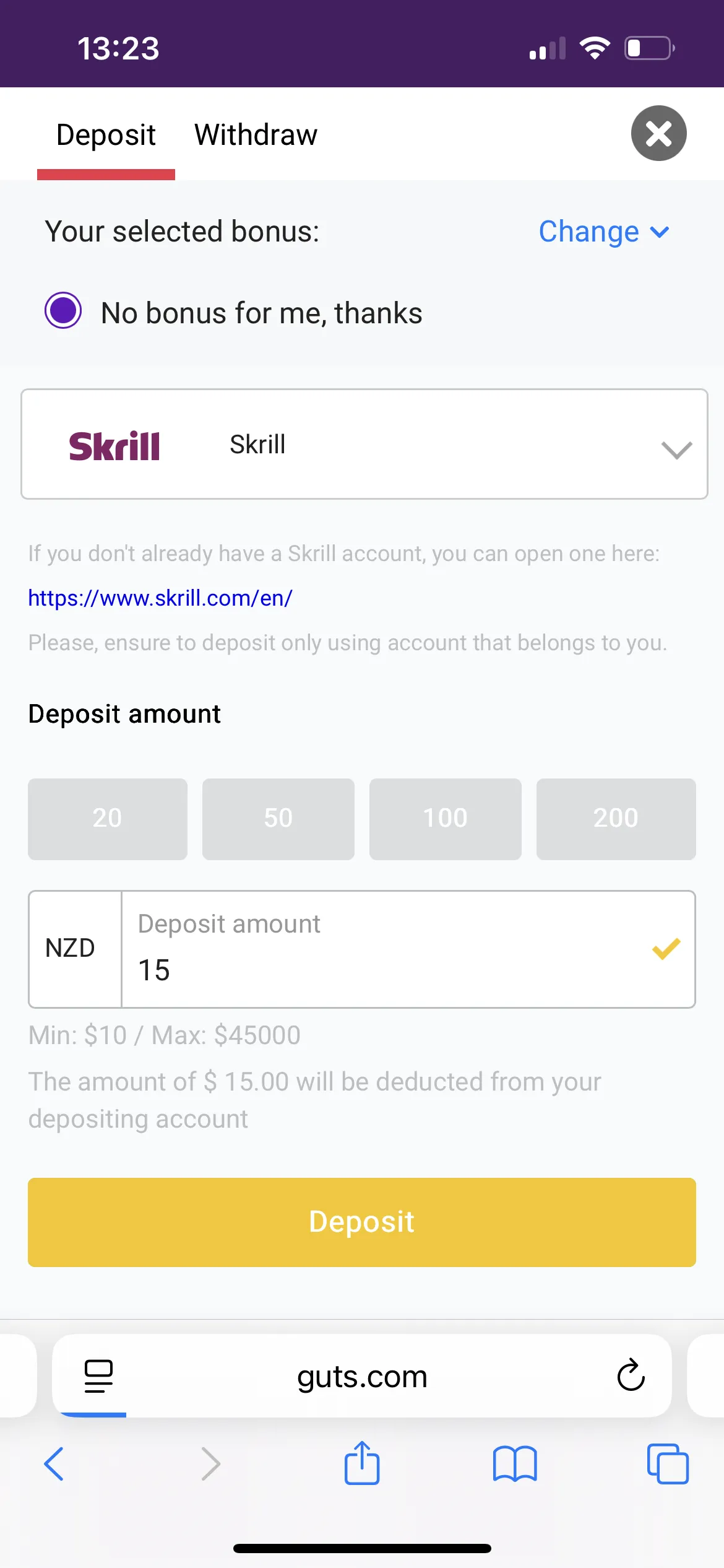 The minimum sum Guts Casino allows you to cashout via Skrill is 20 NZD. I requested 50 NZD. I was happy to receive my win within an hour. So I was glad I didn’t have to track my withdrawal and worry about it.