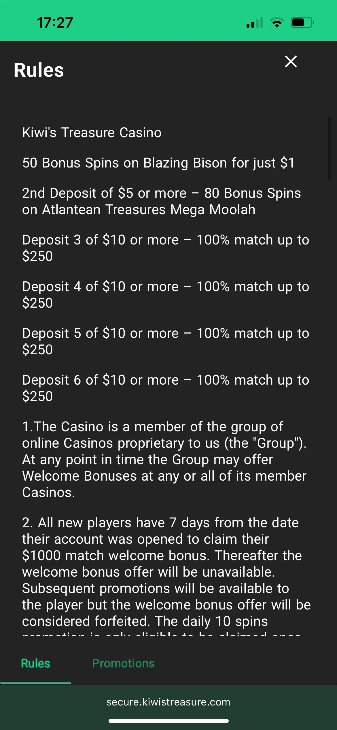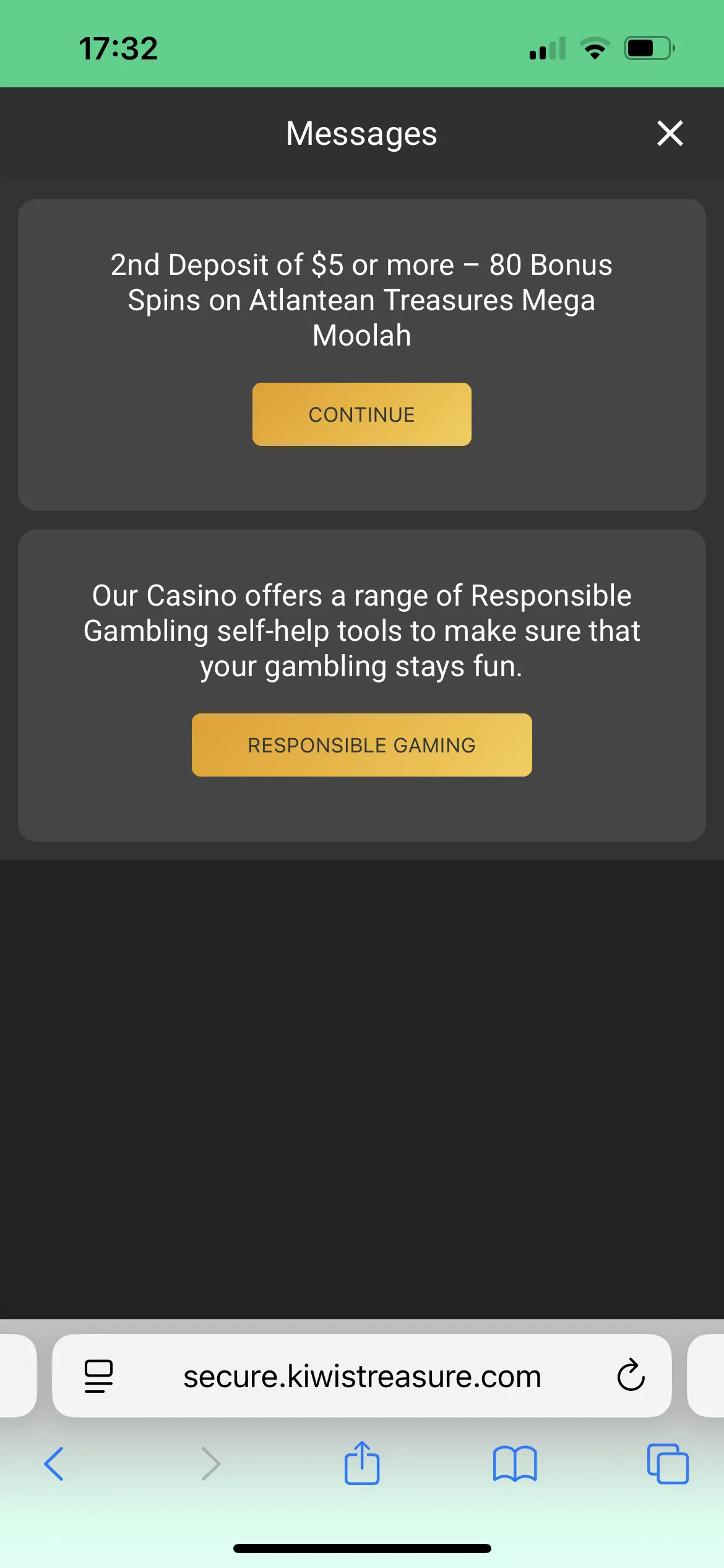 The next deposit required was 5 NZD, which I met, and I was given 80 free spins on the Atlantean Treasures Mega Moolah pokie. And for the third deposit of 10 NZD, Kiwi’s Treasure gave me a 10 NZD bonus.