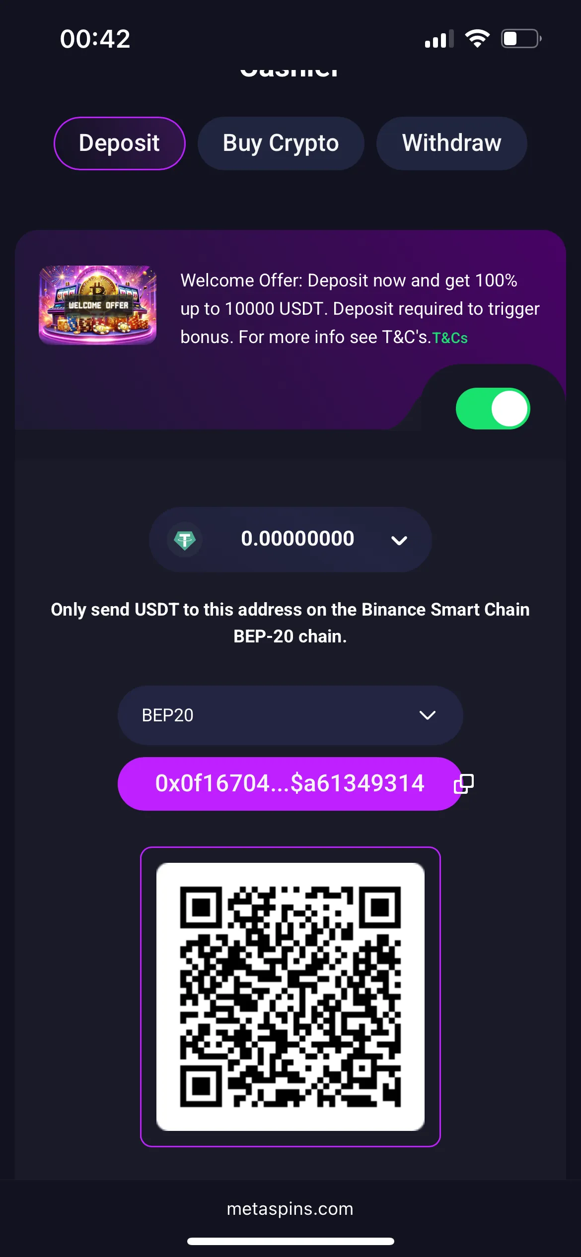 I chose the USDT network BEP20 for my first deposit. Also, I paid a commission of 0.01 USDT. To get a welcome bonus, I funded my account with 15 USDT and got a 100% bonus. Also, I was given an opportunity to spin the Loot Box (this feature is available daily). I didn’t even need to add a Metaspins $1 deposit.