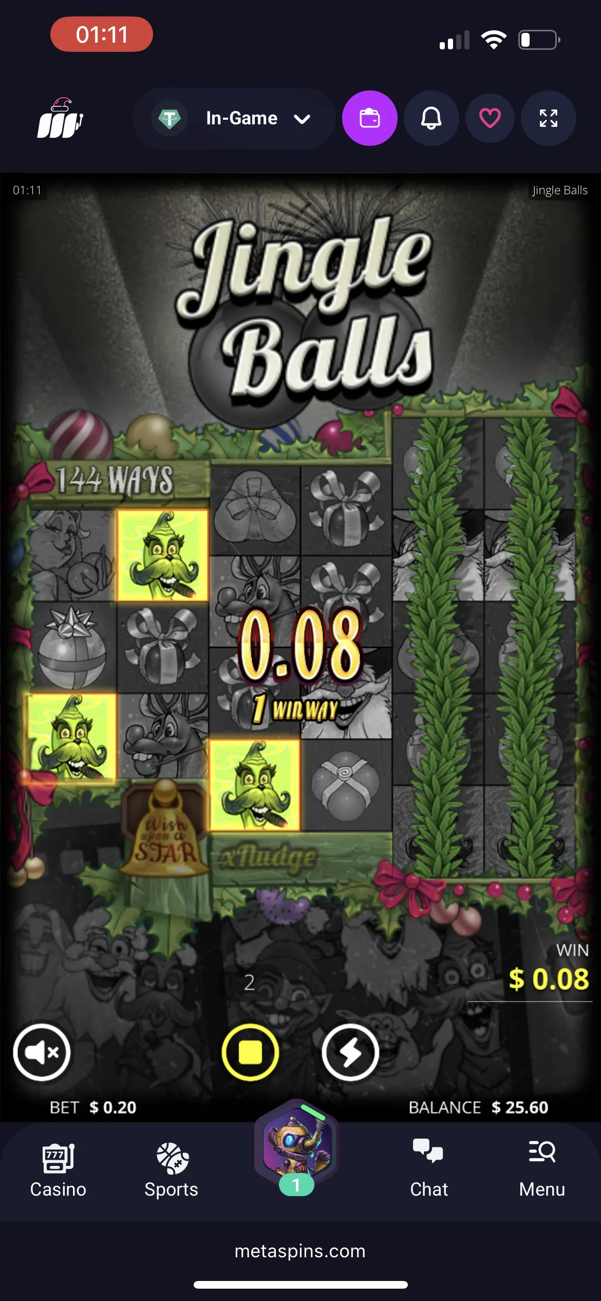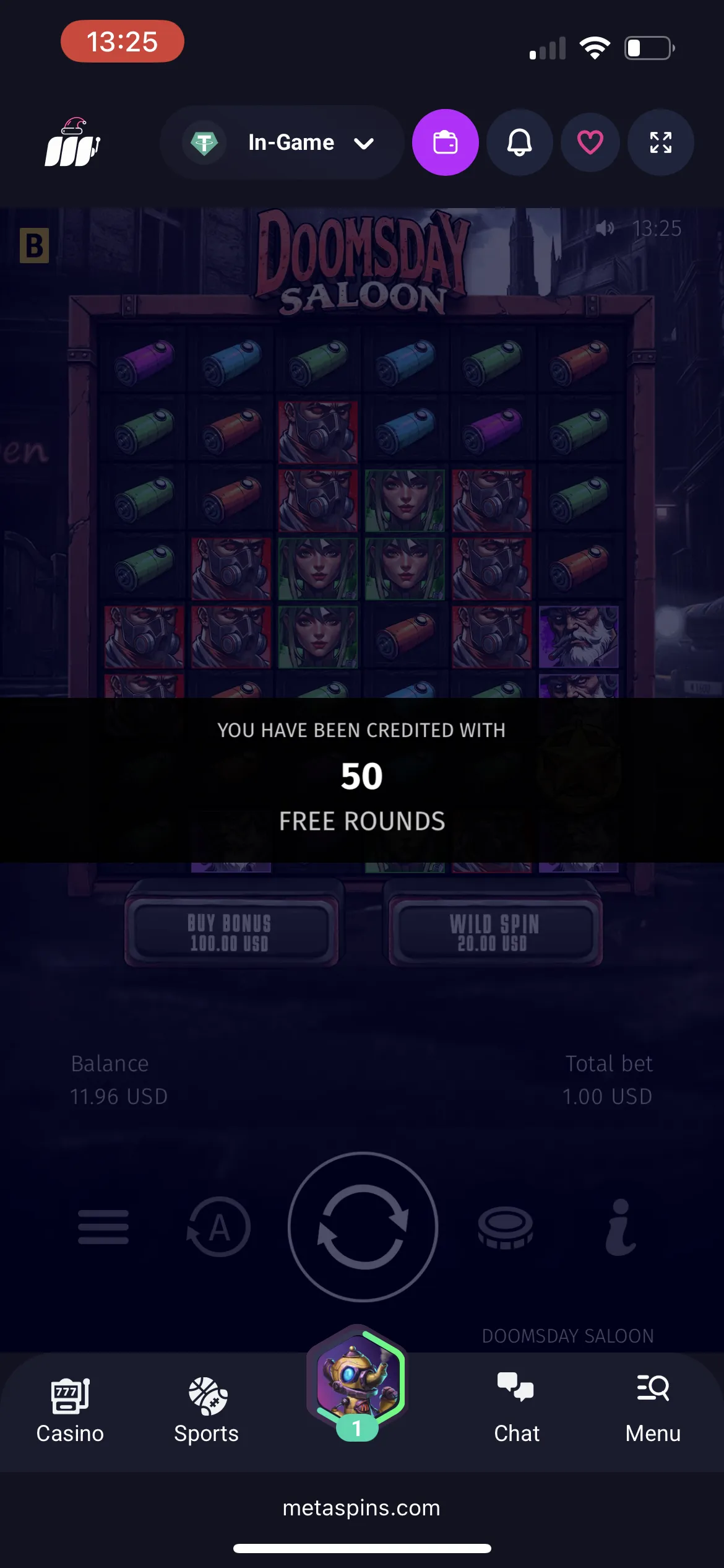 While playing for real money, I moved to the 2nd VIP level and received 50 Metaspins free spins for Doomsday Saloon and even managed to win 11.70 USDT, which made me super happy.