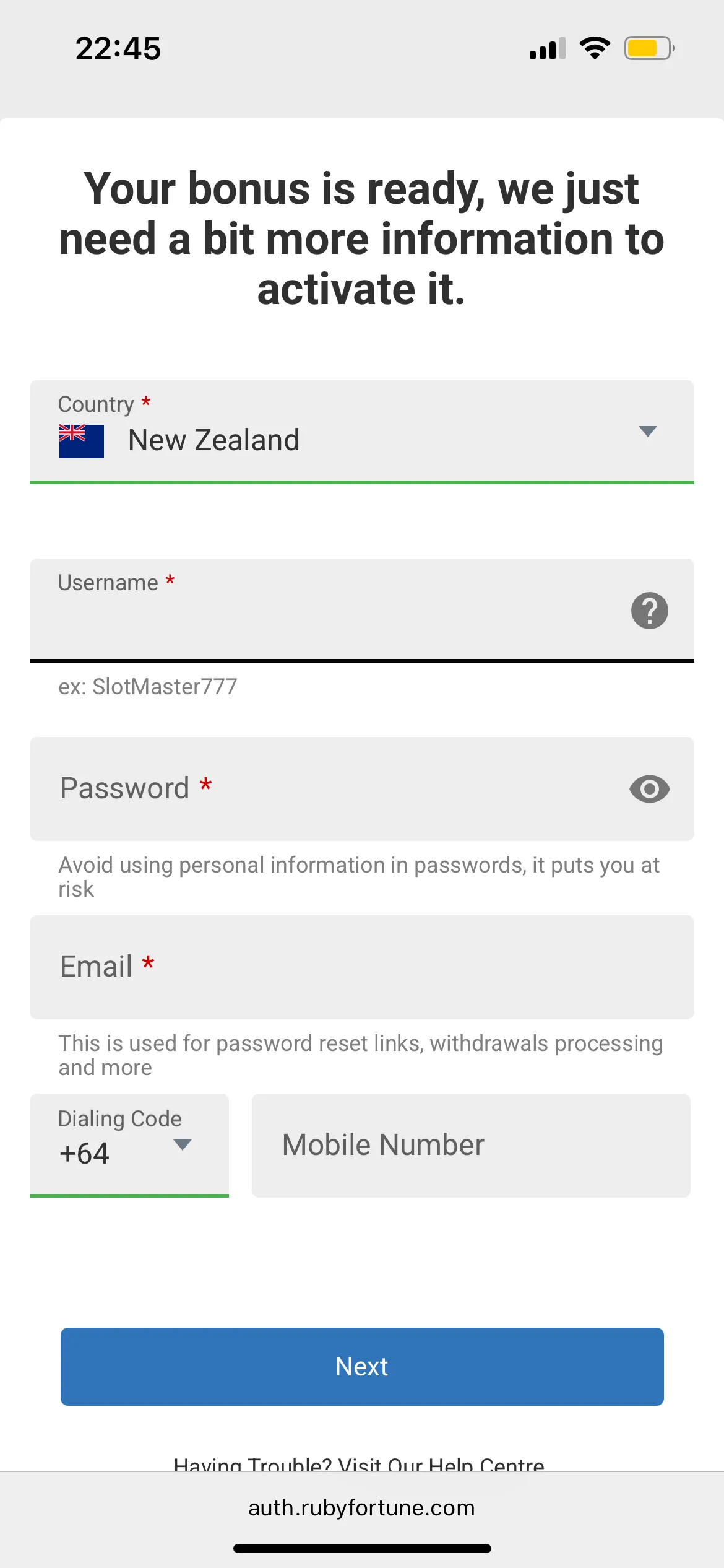 Registration at Ruby Fortune Casino From New Zealand