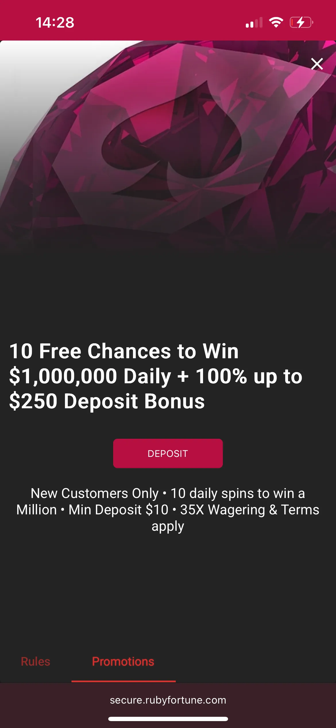 The welcome bonus I received was a 100% deposit match and 10 Ruby Fortune free spins on Mega Millionaire Wheel. So my bonus was 20 NZD + 10 FS. Not bad. Additionally, the wagering requirement for the newcomer deal is 35x, which is not too bad either.