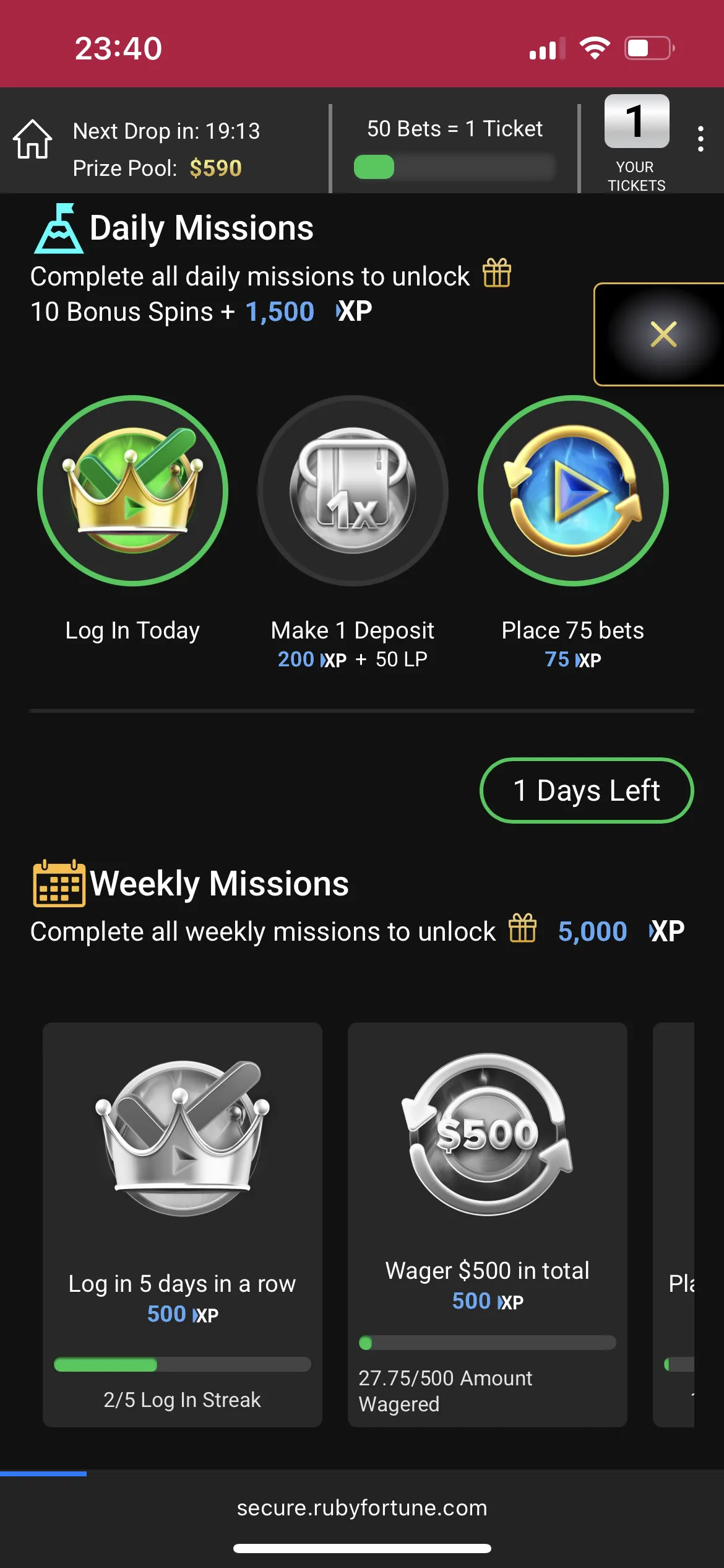 I also discovered a mission system on the site. Ruby Fortune offers you to play a list of particular games with a bet size for which you will receive points. There are daily and weekly missions, which I believe can be fun and give more winning opportunities. It is quite tempting, and there is an incentive to play and receive bonuses.