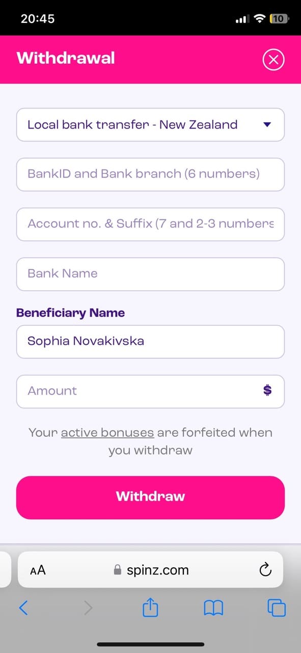 When I came to withdraw money, the only available option for me was a bank transfer with 50 NZD minimum. Bank cards and e-wallets came with a minimum of 20 NZD withdrawal, which certainly could have been more convenient. So I had to provide my bank ID/branch, account number, full name and enter the withdrawal amount. ID verification was not necessary before withdrawal, which was a massive pro.