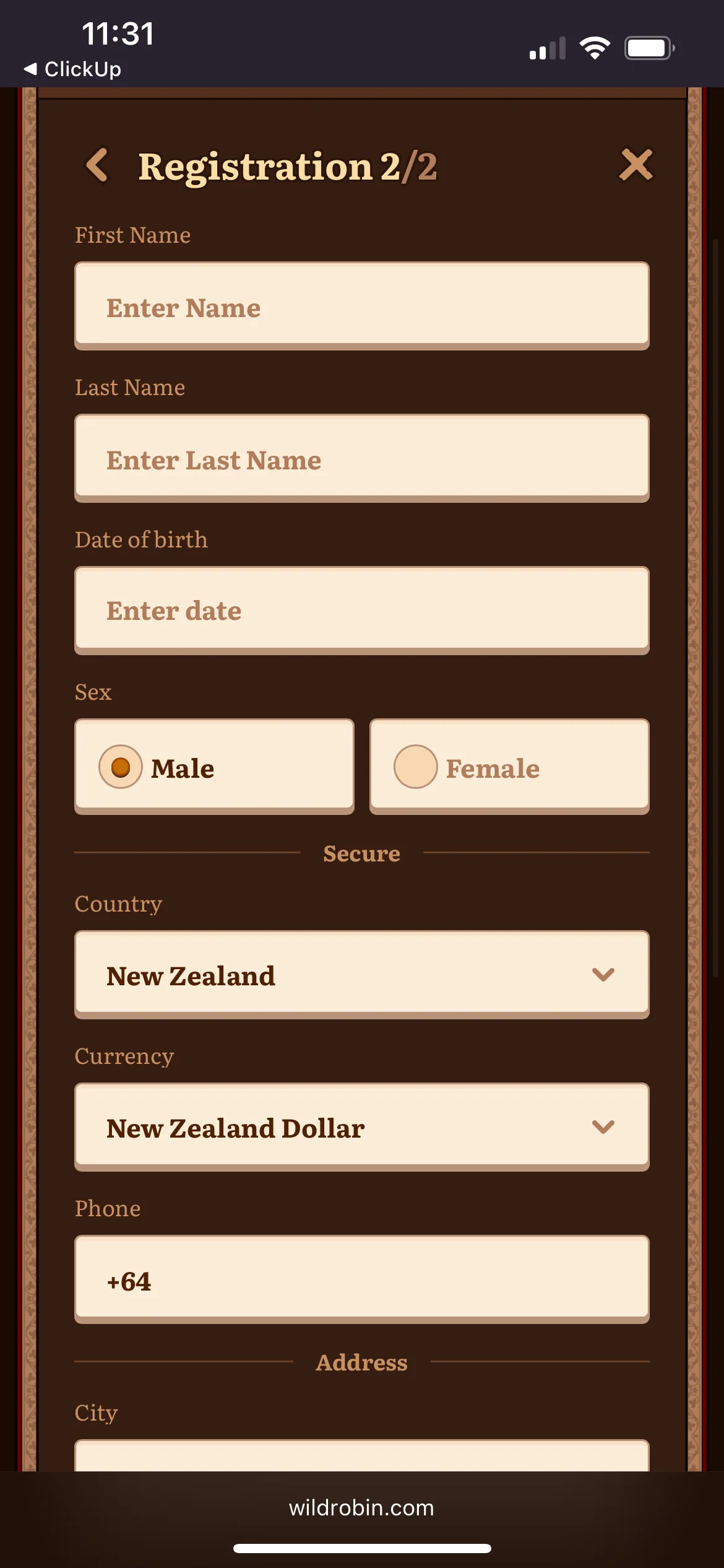 To get started at Wild Robin casino it will only take a few short minutes before you are ready for action. Players will need to enter the official casino website from a desktop device or after installing an app hit the registration tab. Players then get the opportunity to claim a welcome bonus, a sports bonus or click I do not want a bonus. The next steps will serve you in creating an account at Wild Robin Casino: