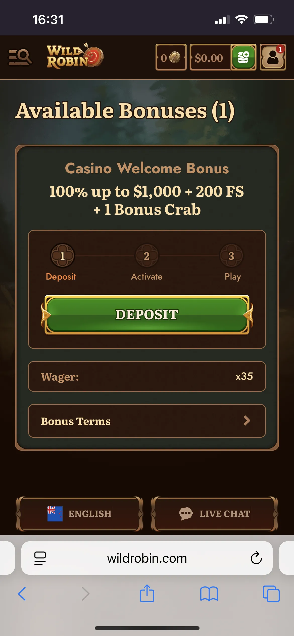 The registration process at Wild Robin is identical to many other popular NZ casino sites with name, address, phone number, email, and password. I chose a casino welcome bonus since it seemed pretty generous: 100% up to 1,000 NZD + 200 free spins and 1 bonus crab. But in reality, each bonus can be claimed once at a time. So the first bonus I claimed was 100% with the wager 35x and after I was eligible to claim free spins. Wild Robin Casino credits 20 FS at once but for 10 days. If I spent 3-5 days playing the first bonus, then during these days I would lose the opportunity to win and test my luck with 60-100 bonus spins.