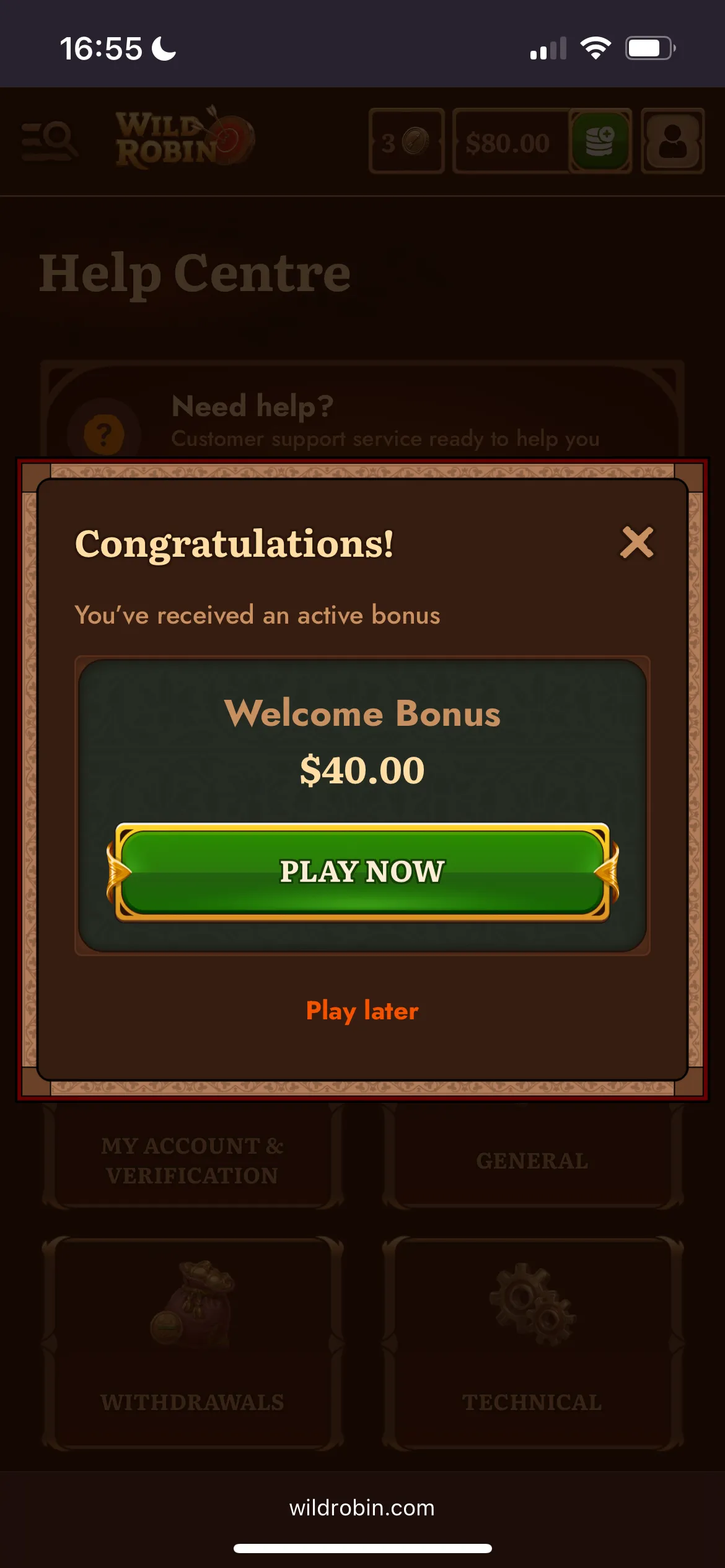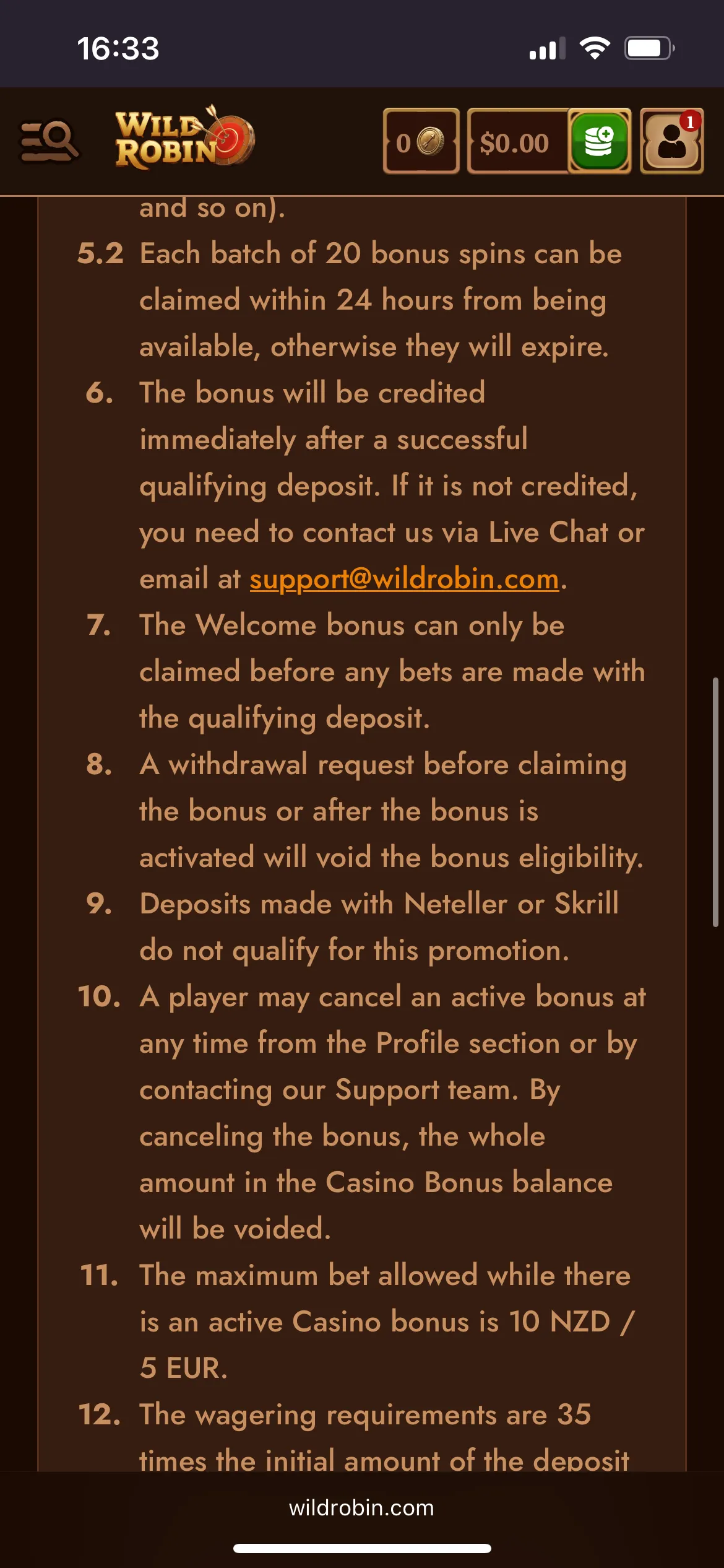 Anytime you require assistance, head to the help centre tab at the bottom of the homepage. You will then find various tabs which offer support such as Deposits, Account Verification, Casino, Withdrawals, Bonuses and Promotions, Sportsbook, Technical and General. If these tabs do not help you can send an email at [email protected] or hit the live chat tab for instant assistance. The Wild Robin site suggests that customer support operates around the clock 24/7 plus I discovered the casino hires real agents who are willing to help and provide all the necessary information to make your experience better.