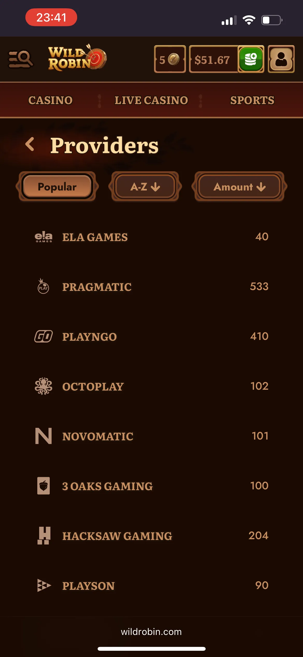 There are tons of exciting games to feast on at Wild Robin Casino. At my last count, it was over 11,000 titles from 99 providers that I added to the table for better understanding. This number of games is undoubtedly impressive for a new casino site, so I was certainly impressed. There are categories for easier navigation: Providers, Top, New, Popular, Bonus Buys, Megaways, Live Games, Instant Games, Pokies, Table Games, and All Games.